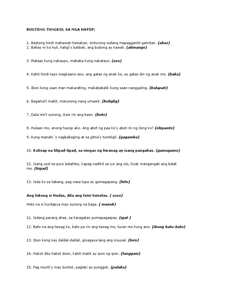 20122018 Isa sa mga usong libangan ng mga bata noon ay ang bugtong. ALAMAT Noong unang panahon ang mga hayop ay nakapagsasalita at nagkakaintindihan. Ang ganda tlga ng riddles nu Gzzz2 rin u.