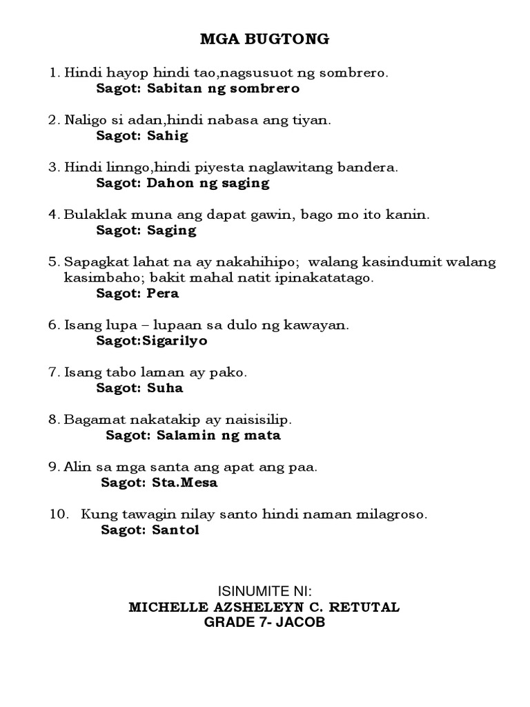 Bugtong sagot ay aso. Suso snail Pagmuntiy may buntot paglaki ay punggok. Learning task 3 answer the following word provlems 1it took jose two thirds of an hour to complete his math home work on monday three fourths of an. Aratiles Bugtong 73 Ginto sa kalangitan Di matitigtitigan.